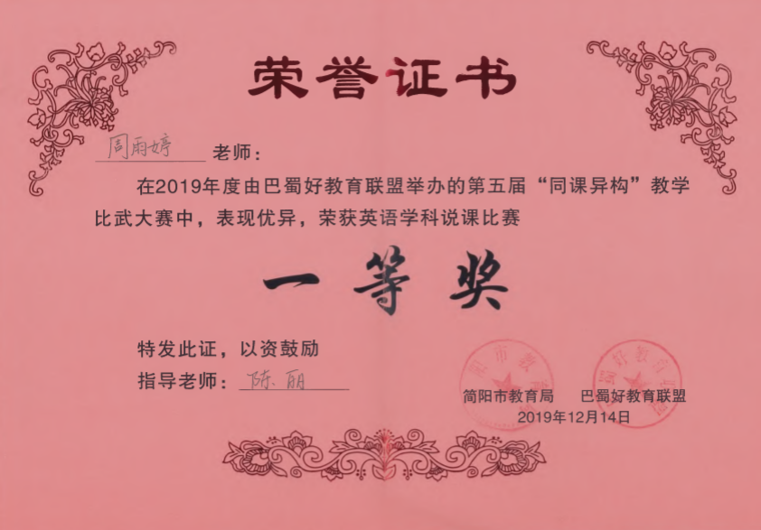 为了更好的提升青年教师的学科教学能力和说课能力,江油中学教务处组织学校语文、数学、英语、物理、化学、生物等学科教师参加了2019年度“同课异构”冠军总决赛巴蜀联盟赛区的预选赛。本次赛事分科、分段举行,前后历时近2月,在已完成的比赛中,江油中学英语教师周雨婷荣获一等奖,语文教师罗琴、物理教师王东、化学教师苏小芹荣获二等奖。
