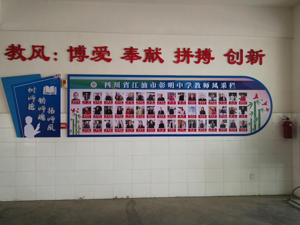 在校园文化建设中,彰明中学实现了底蕴丰富的名校传统与适应互助要求的共同体文化的有机统一。文化建设有丰富的载体和表现形式,既有抬头可见的楼道文化,又有彰显先进表彰进步的展示文化;既有班级文化墙,又有学校宣传横幅:校园文化氛围浓厚。