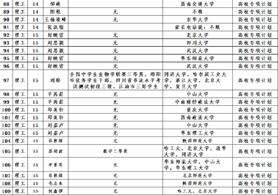 四川省江油中学关于2020级(2023届)高中毕业生申报高校特殊类招生考生材料的公示 来源: 发布时间:2023-04-25 17:18:55 浏览次数: 次 【字体:小 大】 根据《国务院关于深化考试招生制度改革的实施意见》、教育部有关特殊类招生考生规定和四川省教育考试院有关要求,现对我校2020级(2023届)部分高中毕业生拟申报高校专项计划和强基计划招生考试的考生材料进行公示,信息如下: 分享到: 【打印正文】